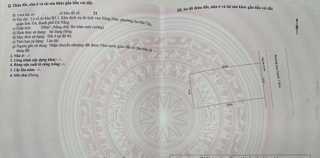Gia đình cần bán lô đất 600m2 tại đường Hoa Hồng 4, thuộc khu Erovilla , sát cầu Trần Thị Lý Lô Đất Gồm 2 Mặt Tiền, trước là đường Hoa Hồng 4, Sau là đường công viên bờ sông hàn - Điểm nhấn: + Hướng cửa chính: Đông, tạo phong thủy tốt + Mặt tiền rộng 24m Khu nhà ở đẳng cấp nhất Đà Nẵng Cực kỳ an ninh, yên tĩnh và mát mẻ - Gần các tiện ích: + Cách trường học trung tâm anh ngữ Pingo, anh ngữ quốc tế Fisher's Superkids Academy khoảng 2km. Liên hệ để biết thêm chi tiết: Nguyễn Xuân Nhật Đặc điểm nổi bậtDiện tích :600m2Mặt tiền :24mGiá :Giá thỏa thuậnĐường vào :7.5m
