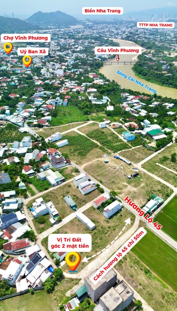 A439. BÁN ĐẤT GÓC 2 MẶT TIỀN THÔN TRUNG, VĨNH PHƯƠNG GIÁ CHỈ 1 TỶ 470 Diện tích: 94,9m Hướng: Tây Bắc & Tây Nam Đường: 6m, ô tô vào tận nơi Vị trí: Cạnh đường lớn HL45, trục kết nối Diên Phú Diên Khánh Ưu điểm nổi bật: Lô đất góc 2 mặt tiền, thoáng mát thuận lợi xây nhà ở, kinh doanh nhỏ. Gần trường học, chợ, UBND, trạm y tế tiện ích đầy đủ. Khu dân cư hiện hữu, hạ tầng hoàn thiện, tiềm năng tăng giá cao. Giá bán: 1 tỷ 470 triệu (có thương lượng nhẹ) Thuế phí: Chủ loĐặc điểm nổi bậtDiện tích :94.9m2Giá :1,47 tỷĐường vào :6m