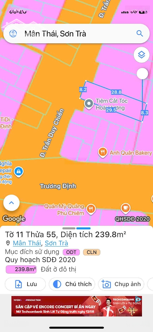 Nhanh tay sở hữu lô đất vị trí đắc địa tại Trần Duy Chiến, p Mân Thái, Q.Sơn Trà, Đà Nẵng. Diện tích 240m2, giá 25 tỷ VND, đất thổ cư, pháp lý đầy đủ. Ưu điểm: + Tặng ngôi nhà vườn rất đẹp. + Vị trí đắt địa, cách biển du lịch Mân Thái đúng 500m + Mặt tiền rộng 8.2m, thích hợp cho kinh doanh, xây dựng căn hộ, khách sạn. + Đường vào rộng 11.5m, thuận tiện cho xe ô tô di chuyển. + Khu vực phát triển, xung quanh có nhiều tiện ích. Gần các tiện ích: + Gần siêu thị Winmart+ + Có công viên cá voi, công viên tượng đài Mân Thái, công viên hồ Nghinh. Liên hệ ngay để biết thêm chi tiết: HUYNH VAN THANH Đặc điểm nổi bậtDiện tích :240m2Mặt tiền :8.2mGiá :25 tỷĐường vào :11.5m