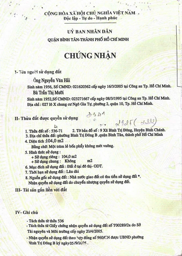 *** Địa chỉ: Mặt tiền Đường số 41, P. Bình Trị Đông B, Q. Bình Tân *** + Khu Tên Lửa sầm uất bậc nhất quận, gần giao Tên Lửa Đường số 7 + Tiện ích: Aeon Mall, Bệnh viện Quốc Tế CIH, trường học, ngân hàng....... + Diện tích: 4.5 x 25m Vuông vức đẹp, CN 104m² + Hiện trạng: Đất trống, thuận tiện xây mới nhà phố, căn hộ dịch vụ hoặc cho thuê kinh doanh + Pháp lý: Sổ hồng sẵn, công chứng sang tên ngay + Giá bán: 10 Tỷ (thương lượng) *** Liên hệ ngay: Lưu Bình Đặc điểm nổi bậtDiện tích :104m2Mặt tiền :4.5mGiá :10 tỷĐường vào :12m