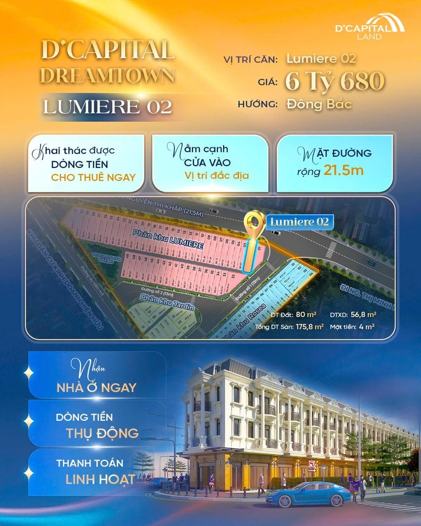 Shophouse tại Nguyễn Thị Khắp, Tân Đông Hiệp, Dĩ An, Bình Dương là một cơ hội tuyệt vời cho những ai tìm kiếm không gian kinh doanh và sinh sống tiện lợi. + Diện tích rộng 80m2, giá 6,48 tỷ VND. + Thiết kế 3 tầng với 4PN và 3WC. + Nội thất cơ bản, sẵn sàng cho việc sử dụng ngay. + Mặt tiền rộng 4m, thuận lợi cho việc kinh doanh. + Ngõ vào 21,5m, dễ dàng tiếp cận bằng xe hơi. + Pháp lý đầy đủ, đảm bảo an tâm cho giao dịch. + Ngay cạnh KCN Sóng thần 1 , 2, VSIP1,... Liên hệ ngay để biết thêm chi tiết và nhận tư vấn từ Đàm Đức Trung qua số điện thoại Đặc điểm nổi bậtDiện tích :80m2Mặt tiền :4mGiá :6,48 tỷSố tầng :3 tầngPhòng ngủ :4 phòngPhòng tắm :3 phòngĐường vào :21.5m