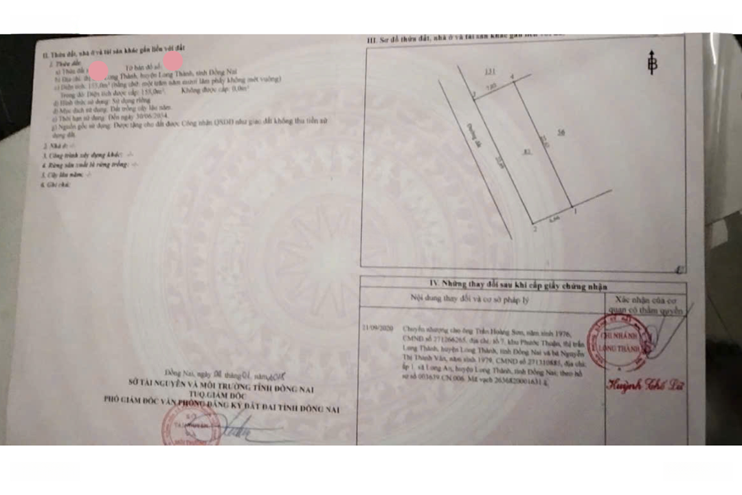 Thông tin tổng quan lô đất. Vị trí: Thị trấn Long Thành, huyện Long Thành, tỉnh Đồng Nai. Diện tích: 155,0m2 (ngang đẹp vuông vức). Loại đất: Đất trồng cây lâu năm, sổ hồng riêng, pháp lý sạch 100%. Hình thức sử dụng: Sử dụng riêng không tranh chấp, không quy hoạch treo. Giá chào bán: 1,6 tỷ đồng TL chính chủ. Hướng đất: Mát mẻ thoáng phong thủy vượng khí. Thời hạn sử dụng: Đến năm 2054. Đặc biệt: Chỉ cách Quốc lộ 51 đúng 200m đường hiện hữu xe ô tô vào tận đất.Đặc điểm nổi bậtDiện tích :155m2Giá :1,6 tỷ