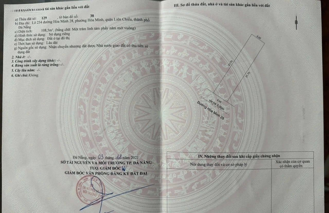 Cần bán lô đất đẹp khu B mt đường Hòa Minh 28, P. Hòa Minh. Q Liên Chiểu. Vị trí gần ngã 4 Nguyễn Sinh Sắc và Hoàng Thị Loan, gần Vincom dự kiến, gần biển, gần chợ, trường học,... khu dân cư đông đúc dân trí cao. Hiện trạng đất trống tiện xây mới nhà ở định cư hoặc căn hộ khách sạn. - Diện tích 5x21.5, tổng 107.5m2 - Hướng Tây Nam - Đường 6m lề 3m - Giá bán chính chủ 5.9 tỷ tl. - Liên hệ để chốt ngay - Hỗ trợ vay ngân hàng 70% giá trị tài sảnĐặc điểm nổi bậtDiện tích :108m2Mặt tiền :5mGiá :5,9 tỷĐường vào :6m