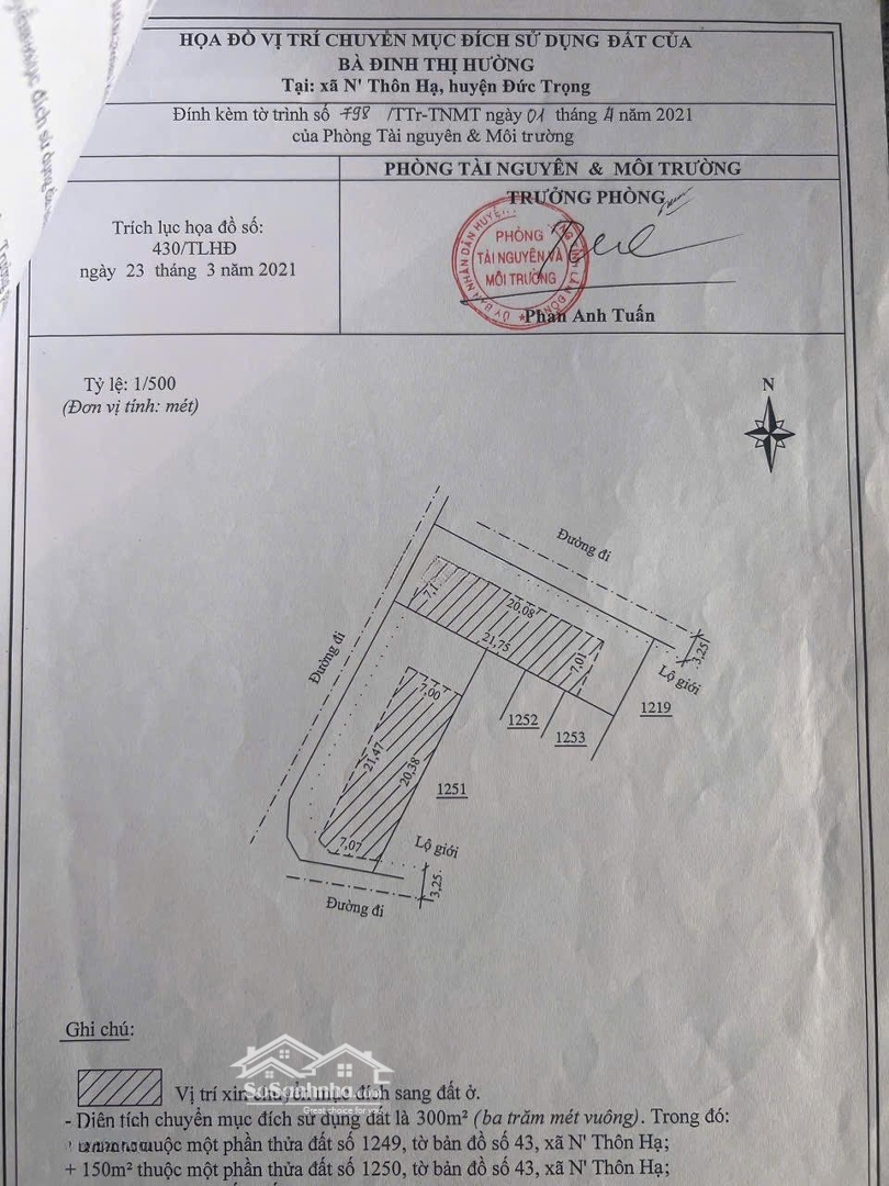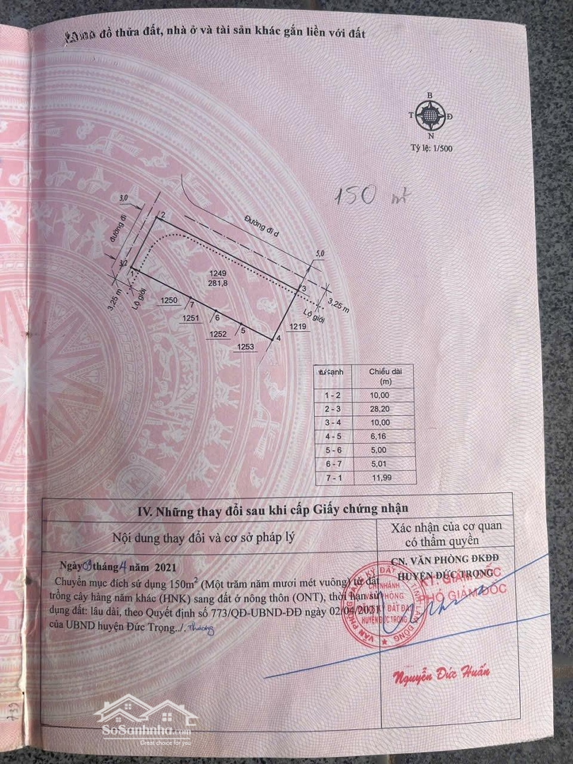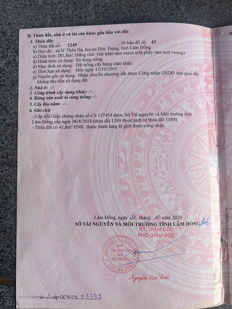 BÁN ĐẤT NTHÔN HẠ ĐỨC TRỌNG, LÂM ĐỒNG GIÁ CHỈ 2 TỶ Vị trí: Thửa đất số 1249, tờ bản đồ 43, xã NThôn Hạ, huyện Đức Trọng, tỉnh Lâm Đồng. Diện tích: 281,8m (có 150m đất ở tại nông thôn ONT, còn lại đất trồng cây hằng năm). Đường: Mặt tiền đường ô tô 5m, giao thông thuận tiện, kết nối dễ dàng đến trung tâm. Pháp lý: Sổ hồng riêng, đã chuyển mục đích sang 150m đất ở, sang tên công chứng nhanh. Thời hạn sử dụng: Đất ở lâu dài. Tiện ích xung quanh: Gần chợ, trường học, UBND xã, thuận tiện cho sinh hoạt hằng ngày. Khu dân cư đông đúc, an ninh tốt. Cách Quốc lộ 20 và Quốc lộ 27 chỉ vài phút di chuyển, dễ dàng đi Đà Lạt Sân bay Liên Khương. Giá bán: 2 tỷ (thương lượng chính chủ) Thích hợp để xây nhà ở, đầu tư giữ tài sản hoặc khai thác kinh doanh nhỏ. Liên hệ ngay: để được xem đất trực tiếp và chốt giá tốt nhất!Đặc điểm nổi bậtDiện tích :281.8m2Giá :2 tỷ