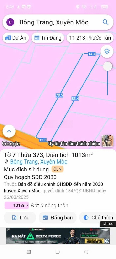 Đất thổ cư tại Xã Bông Trang, Xuyên Mộc, Bà Rịa Vũng Tàu hiện đang chào bán với nhiều ưu điểm nổi bật. + Diện tích rộng 1000m2, lý tưởng cho nhiều mục đích sử dụng. + Pháp lý đầy đủ, đảm bảo an toàn cho giao dịch. + Mặt tiền 12m, thuận lợi cho việc kinh doanh hoặc xây dựng nhà ở. + Đường vào rộng 10m, xe ô tô di chuyển dễ dàng. Liên hệ ngay để được tư vấn miễn phí từ Hạnh qua số điện thoại Đặc điểm nổi bậtDiện tích :1000m2Mặt tiền :12mGiá :1,8 tỷĐường vào :10m