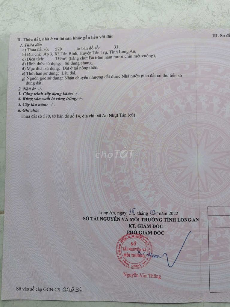 Chính chủ cần tiền bán lại giá vốn thửa đất 2 mặt tiền đường nhựa 5M, DT 360m2 (12M x 30M). Đất full thổ cư, đã san lấp bằng phẵng, gần các khu CN lớn, tiện xây nhà trọ hoặc nhà xưởng, biệt thự. Nằm sát đường DT832 nối tới bến phà long sơn, sông vàm cỏ đông, Di chuyển dễ dàng trong vòng 30 phút (30km) đến TP HCM. Qua khỏi cầu Bến Lức rẽ trái vào DT832. Giá bán 1 tỷ 950 triệu có thương lượng, mua 3 năm trước đây giá 2 tỷ.