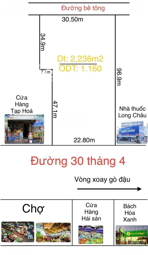 Bán kiot+ nhà trọ .2 mặt tiền đường 30 tháng 4 .vị trí kinh doanh sầm uất.ngay trung tâm thủ dầu một . Diện tích :2236 m trong đó có 1160 ODT Vị trí : kế lô góc , đối diện chợ Cách siêu thị coopmat 200 m Cách sân banh gò đậu 400 m Đang cho thu nhập 200 triệu /tháng Giá bán :88 tỷ Lh Việt gcĐặc điểm nổi bậtDiện tích :2236m2Giá :88 tỷ
