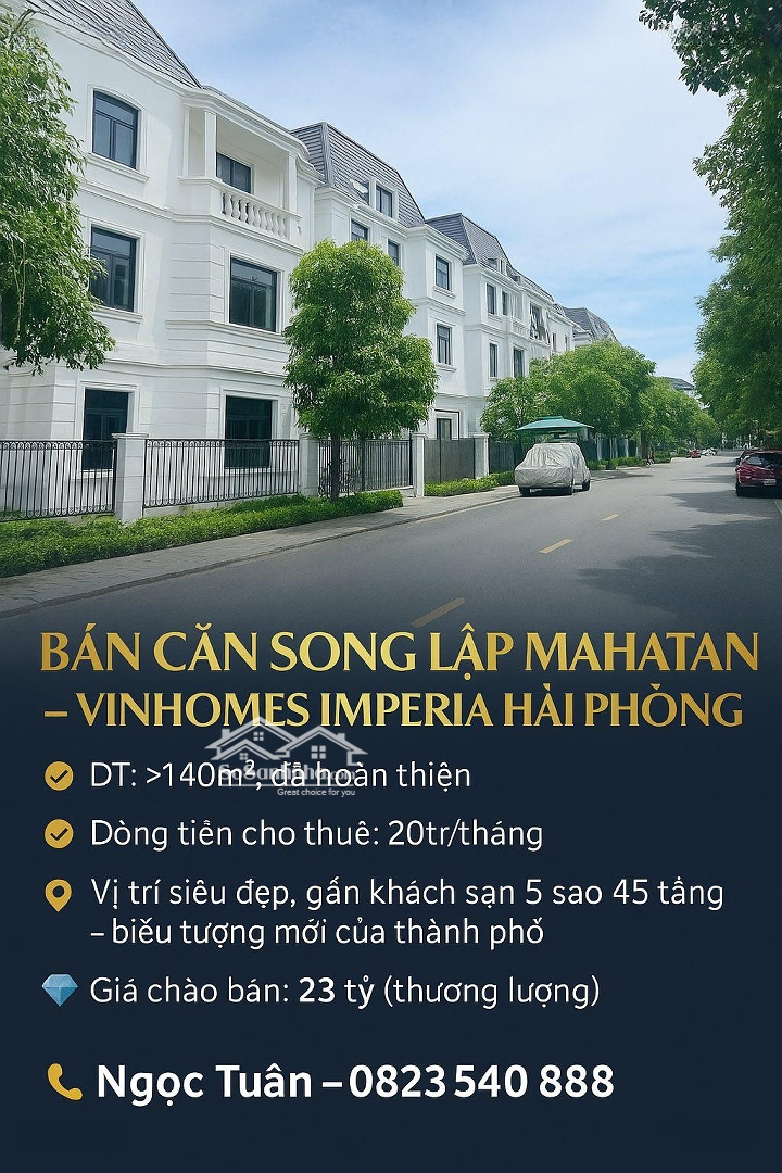 Bán căn song lập Mahatan Vinhomes Imperia Hải Phòng. Diện tích: Hơn 141m² x 4 tầng thang máy. Hiện trạng: Nhà đã hoàn thiện, đang cho thuê tầng 1 và tầng 2, khai thác ổn định với dòng tiền 20 triệu/tháng. Vị trí đắc địa: Nằm tại phân khu Mahattan, trung tâm KĐT Vinhomes Imperia sát cạnh tòa khách sạn 5 sao 45 tầng, biểu tượng mới của Hải Phòng. Điểm nhấn giá trị: Sản phẩm song lập hiếm tại khu đô thị kiểu mẫu duy nhất của Vingroup tại Hải Phòng. Vị trí chiến lược, thuận lợi kinh doanh, cho thuê hoặc khai thác đa mục đích. Dòng tiền sẵn có, vừa khai thác vừa gia tăng giá trị theo thời gian. Giá chào bán: 23 tỷ (thương lượng trực tiếp). Liên hệ ngay để sở hữu: Ngọc Tuân Chuyên tư vấn & giao dịch bất động sản cao cấp tại Hải Phòng.Đặc điểm nổi bậtDiện tích :141m2Giá :23 tỷ