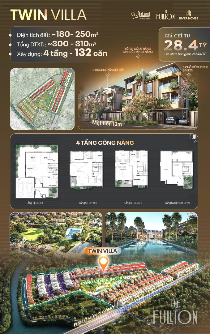 Biệt Thự Song Lập Vip The Fullton - Thiết kế độc bản & Tối ưu công năng - Siêu phẩm Limited - Tiêu chuẩn khép kín an ninh 24/24 Diện tích 180m2 x 4 tầng x mặt tiền 12m. - Thiết kế độc bản, tối ưu công năng - Sẵn ô chờ thang máy, khoảng thông tầng duplex - Gara Oto trong nhà. - Có riêng toà văn phòng, trường học phục vụ cư dân. - CĐT có riêng club Fullhaus với khu mua sắm, vui chơi giải trí ăn uống phục vụ riêng cho cư dân. - Kết nối siêu nhanh đến Quốc lộ 5A, cao tốc 5B, TTTM, bệnh viện Vinmec. - Chủ Đầu Tư: Capitaland. - Pháp lý: Sổ đỏ lâu dài. - LH Mr Đức ( Booking chiết khấu 330 triệu thẳng vào giá bán )Đặc điểm nổi bậtDiện tích :180m2Mặt tiền :12mGiá :28,4 tỷSố tầng :4 tầngPhòng ngủ :5 phòngPhòng tắm :5 phòngĐường vào :15m