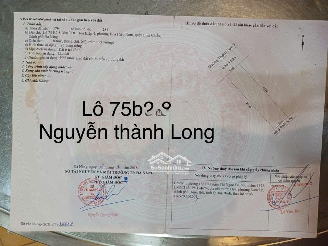 Cần bán lô đất đường 7m5.lề 4m 5x20 100m2.hướng đông nam truc thông lakeside homlen.bên cạnh day shophuos hiện đại.gần chung cư đang được phát triển hiện đại của dự án.chuẩn bị xây 9 toà.dân cư đông đúc sầm uất.sổ đỏ chính chủ cần bán là 3ty750.gần trường học gần chợ gần bệnh viện gần biển vài bước chân.gần dự án dragon.truc thông mê Linh bà nà.tiep khách thiện chí mua ở hoặc đầu tư Sinh lời liên hệ sđt và Zalo làm việc chính chủĐặc điểm nổi bậtDiện tích :100m2Mặt tiền :5mGiá :37,5 triệuĐường vào :7m