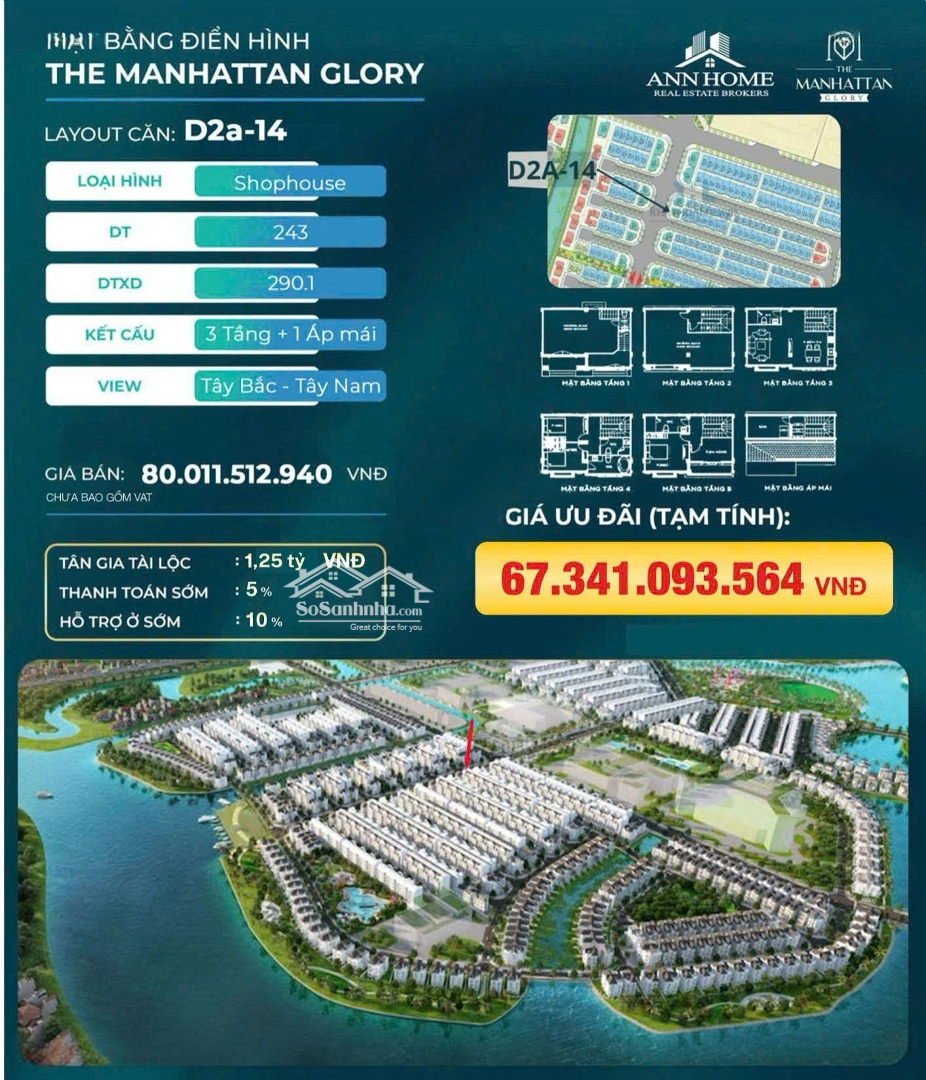 Cần Bán Nhanh Căn Shophouse D2a-14 Khu The Manhattan Glory Dt 243m2 Xây 3 Tầng Giá Chỉ 67,34 Tỷ