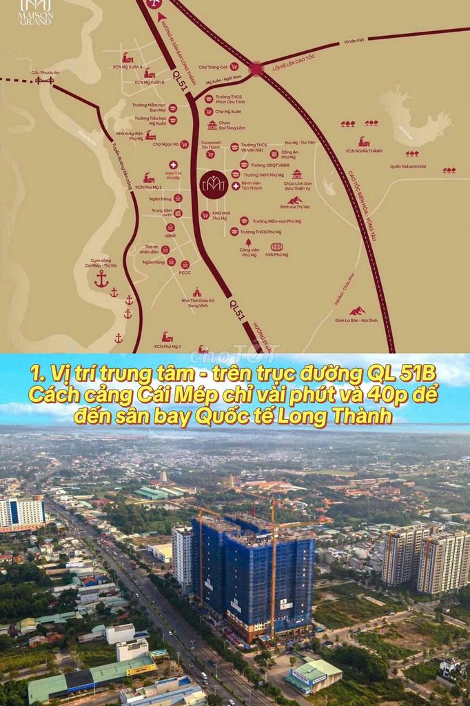 Giá bán: 33tr - 36tr/m². Thanh toán 15% kí HĐMB Thanh toán đủ 50% nhận nhà. Còn lại thanh toán chậm trong 12 tháng. Nhận nhà quý 2/2026. Vị Trí: Mặt Tiền Quốc Lộ 51, P Phú Mỹ TPHCM(Bà Rịa Vũng Tàu Cũ). Chủ đầu tư: Cty TNHH Tùng Mỹ (Tumys homes). Quy mô: 1ha bao gồm 2block, 2tầng hầm, 25 tầng nổi. Mật độ xây dựng: 40%. Tổng số sản phẩm: 1248 căn hộ và 55 shophouse khối đế. Diện tích căn hộ: + 2PN1WC: 55m². + 2PN2WC: 69m². Tiện ích nội khu: Hồ bơi, khu BBQ phố đi bộ, trung tâm thương mại, Gym. + Gần cảng cái mép + thị vải, cách biển Vũng Tàu 30 phút duy chuyển. Cách KDL Long Hải, Hồ Tràm 20ph. Về trung tâm TP. HCM 60km. Mở bán 08/2025. Chiết khấu: + 3% cho 100 booking tiếp theo. + 2% cho 100 booking tiếp theo. + 1% cho 100 booking tiếp theo. Ngân hàng cho vay 70% giá trị căn hộ.