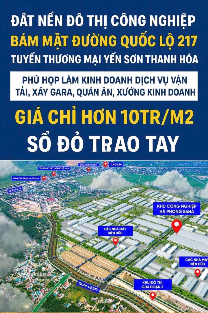 CHỈ TỪ 9 TRIỆU/M ĐẤT VÀNG KINH DOANH MẶT QUỐC LỘ 217 ĐÔ THỊ CÔNG NGHIỆP YẾN SƠN SỐ LƯỢNG LÔ CÓ HẠN KHÔNG ĐỢI ĐƯỢC LÂU! KĐT Công Nghiệp Yến Sơn Hà Trung Thanh Hoá Vị trí vàng ngay mặt đường QL217 kết nối trực tiếp QL1A & Cao tốc Bắc Nam tới Hệ thống cảng đường thuỷ Thanh Hoá. Kề cận KCN Hà Phong 100ha nơi hàng nghìn công nhân, chuyên gia tập trung Lô 08: 164,1m² Mặt tiền 6m Giá chỉ từ 1,6tỷ Lô 09: 168m² Mặt tiền 6m Giá chỉ từ 1,65tỷ Lô 18: 180m² Mặt tiền 6m Giá chỉ từ 1,76 tỷ Công năng kinh doanh cực đỉnh: Gara, trạm dừng nghỉ, nhà hàng, dịch vụ vận tải, cho thuê kiot, nhà trọ công nhân Giá tốt nhất khu vực: Chỉ từ 9,8tr/m² Cơ hội sở hữu đất vàng mặt quốc lộ hiếm hoi! Liên hệ ngay: Miễn phí tư vấn & đi xem đất) Inbox để nhận mặt bằng & bảng giá chi tiết ạĐặc điểm nổi bậtDiện tích :180m2Mặt tiền :5mGiá :1,8 tỷĐường vào :7.5m