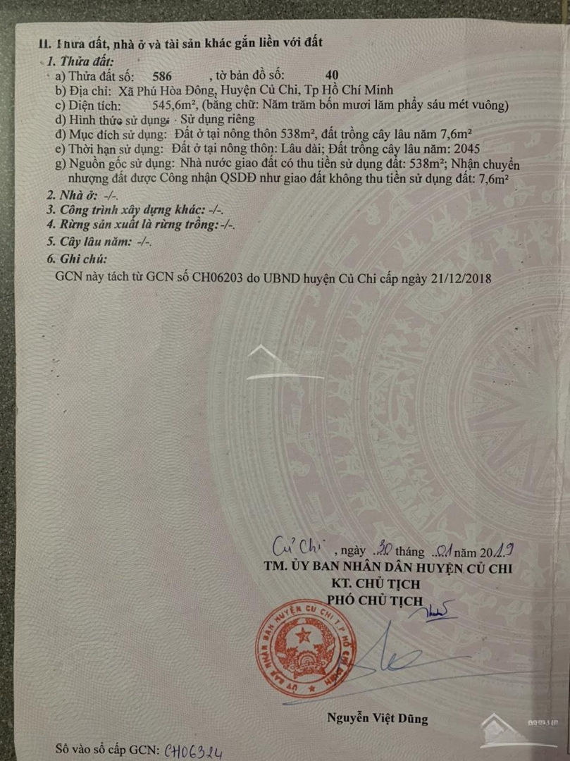 Đất Củ Chi, diện tích 545m2, thổ cư 100%, gần chợ, trường học, đường mới làm rất rộng, xe tải vào được, sổ hồng riêng.