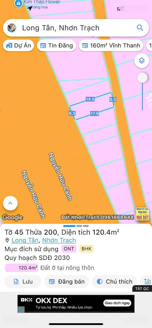 Bán đất mặt tiền đường Nguyễn Hữu Cảnh, Long Tân, Nhơn Trạch. DT: 120m2 (6*20m) full thổ cư. Xây dựng 7 tầng cộng hầm. Ngay ngã 3 Cây Dầu, kinh doanh mọi mặt hàng. Cách Vành Đai 3 3Km Phù hợp để làm văn phòng, trụ sở công ty, làm của để dành cho con cái. Đối diện nhiều dự án lớn sắp mở bán. Liên hệ em Dung: 24/7.Đặc điểm nổi bậtDiện tích :120m2Giá :5,5 tỷĐường vào :47m