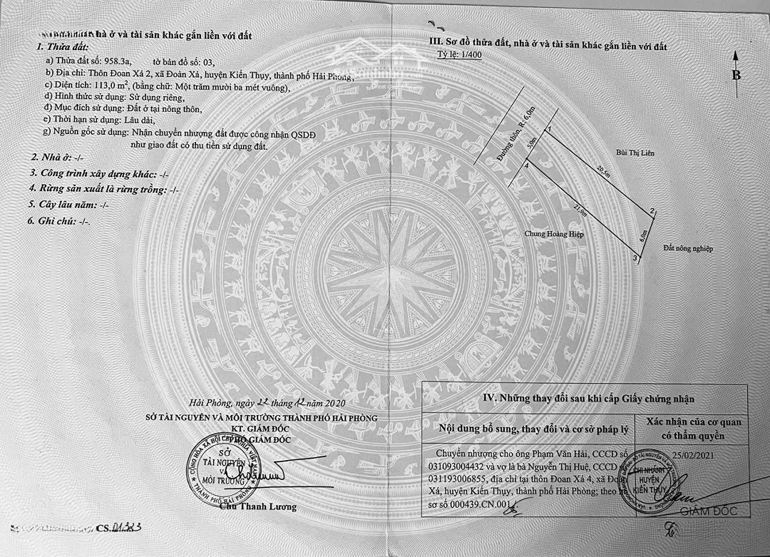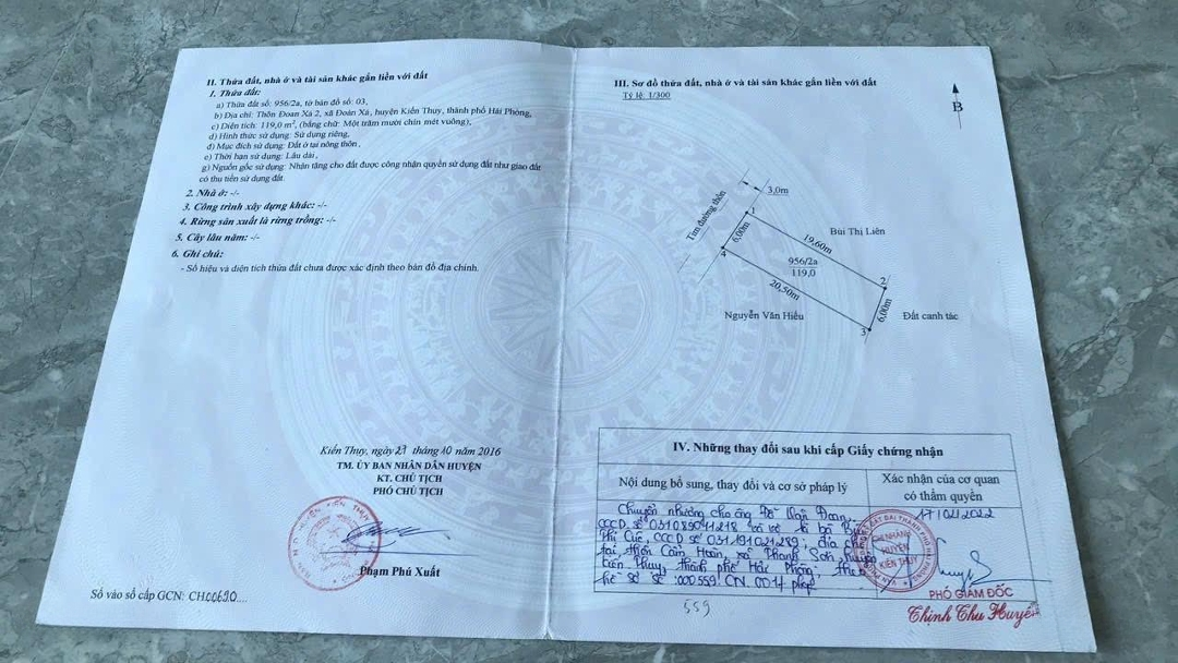 . Chủ cần Bán 2 lô đất cạnh nhau tổng 232m2 ngag 11m ( nở hậu )mặt đường nhựa Đoàn Xá 2 - Kiến Thụy . gần khu CN - Cảng logitic chuẩn bị triển khai vị trí đẹp tiềm năng.Ko quy hoạch . Lô 1-DT:119m2 mặt tiền 6m rất đẹp Lô 2 -DT :113m2 ngang 5m ( nở hậu ) Tiện ích xung quanh đầy đủ.gần đường Ven Biển, gần 2 dự án lớn . Giá chỉ 23,x tr /m2 Lh. Đặc điểm nổi bậtDiện tích :113m2Mặt tiền :6mGiá :2,66 tỷĐường vào :6m