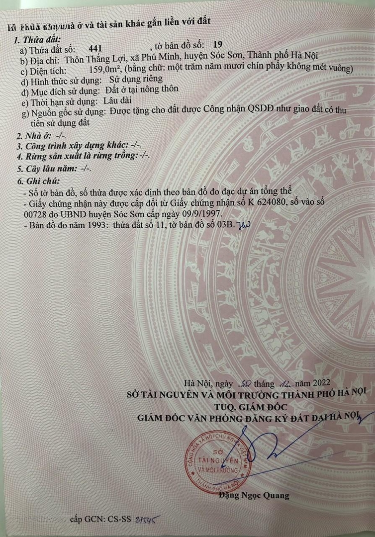 Vị trí siêu hiếm: Ngay mặt đường Quốc lộ 2A, xã Phú Minh, Sóc Sơn (nay là khu đường 3, xã Nội Bài, TP. Hà Nội). Cách sân bay Nội Bài chỉ vài phút và tuyến giao thương huyết mạch. 1. Thông tin bất động sản: - Tổng diện tích: 239m² (gồm 2 sổ đỏ riêng biệt: 80m² và 159m²). - Mặt tiền: 16m cực rộng, hiếm có. - Hiện trạng xây dựng: + Nhà 3 tầng trên diện tích 80m². + Nhà 1 tầng trên diện tích 159m². - Pháp lý: 100% đất ở lâu dài, sổ đỏ chính chủ, sang tên ngay. - Link địa chỉ google map: https://maps.app.goo.gl/9mpAn82ghTJYitUT7 2. Lợi thế nổi bật: - Mặt đường lớn, giao thông nhộn nhịp, lượng khách qua lại đông đúc. - Rất phù hợp để làm showroom ô tô nội thất, cửa hàng, văn phòng, nhà hàng, kho xưởng hoặc cho thuê sinh lời ngay. - Vị trí chiến lược, khai thác tốt cả ở, kinh doanh, hoặc đầu tư lâu dài. 3. Điểm cộng khác biệt: - Khu vực hiếm người bán, tính thanh khoản cực cao. - Giá trị tăng trưởng mạnh nhờ hạ tầng phát triển, gần sân bay và trung tâm dịch vụ logistics lớn nhất miền Bắc. Giá bán: 90tr/m2 có thỏa thuận nếu thiện chí. Liên hệ: Mr. Duy [0913210055] để xem nhà và thương lượng.Đặc điểm nổi bậtDiện tích :239m2Mặt tiền :16mGiá :21,51 tỷSố tầng :3 tầng