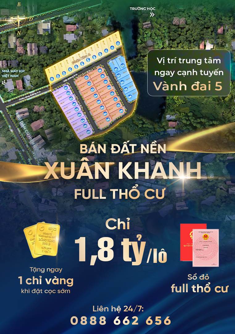 TẶNG NGAY 1 CHỈ VÀNG KHI ĐẶT CỌC SỚM Sở hữu đất ở đô thị ven Hà Nội diện tích 5x10m (50m²) giá chỉ 1,8 tỷ/lô Vị trí vàng: ngay ngã tư Vành đai 5 cửa ngõ Tây Hà Nội 43 lô đẹp sổ đỏ từng lô xây dựng tự do Bao quanh tiện ích: trường học, chợ, bệnh viện, siêu thị trong bán kính 1km Gần hồ Xuân Khanh Đồng Mô sinh thái phong thủy vượng khí Tiềm năng tăng giá mạnh khi Sơn Tây trở thành đô thị vệ tinh Hà Nội Số lượng hữu hạn Ai nhanh tay sẽ thắng lớn! Liên hệ ngay để giữ chỗ suất đẹp nhất hôm nay!Đặc điểm nổi bậtDiện tích :50m2Mặt tiền :5mGiá :1,8 tỷĐường vào :5m