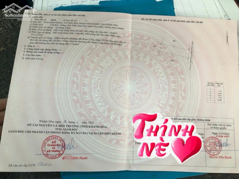 Bán Lô Đất Đẹp Diên Hoà, Diên Khánh, sau trường mầm non. Diện tích 178m2 ngang 7m ( 60m thổ cư ) Hướng Đông Nam - Xây Dựng Tự Do - Cách đường hương lộ 39 chỉ 200m - Đường rộng 3,5m ô tô thông thoáng - Giá: 1 tỷ 390 triệu Liên Hệ: 0987471611 zalo