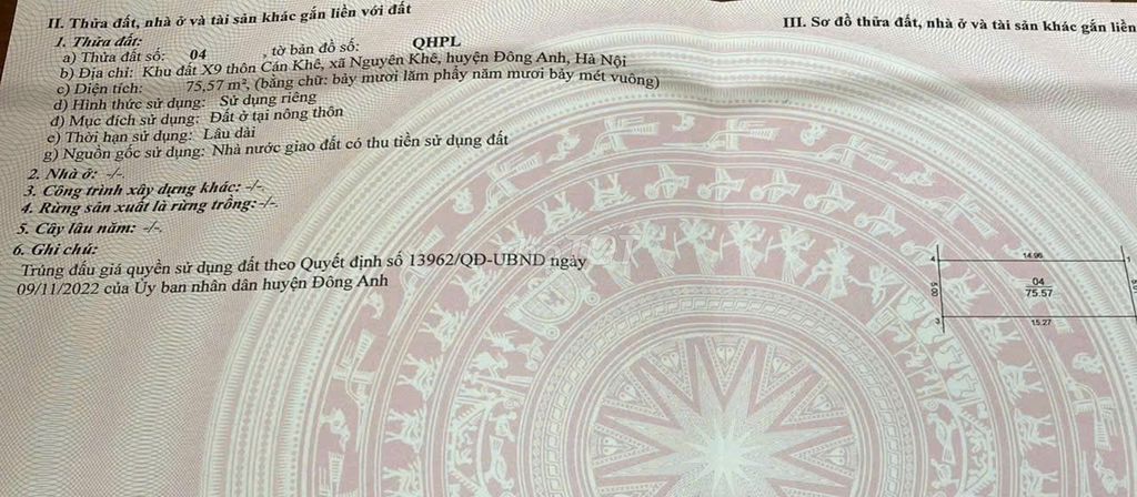 Cần bán 75m2(5×15) đất đấu giá X9 Cán Khê Nguyên Khê, Đông Anh đường rộng 6m vỉa hè 3m hướng Đông Nam. Ngay sát khu dân cư hiện hữu, nhà dân ở, xung quanh nhiều Dự án lớn. Khu đấu giá nằm cách UBND xã Nguyên Khê và đường Lê Hữu Tựu 200m về phía Bắc. Phía Tây khu đấu giá sát đường quy hoạch rộng 40m, hiện trạng là đồng ruộng (tương lai sẽ là 2 mặt đường trước sau). Gần khu tổ hợp công viên cây xanh, bãi thể thao, bãi đỗ xe đang thi công. Bên cạnh là dự án Khu đô thị ALS City. Cách Khu Đô Thị Nguyên Khê 300m. Cách UBND xã 500m. Các dự án mở đường sát khu đều sắp triển khai.Gần khu biệt thự, khu công nghiệp Nguyên Khê. Giao thông thuận tiện, đi Võ Nguyên Giáp, Cầu Nhật Tân, sân bay Nội Bài chỉ vài phút chạy xe… Đất k trụ điện, k đường đâm, ngõ đâm vào. Giá đầu tư tiềm năng tăng giá cao khi đường mở và các dự án lớn đồng loạt triển khai trong thời gian gần., sổ sẵn giao dịch ngay