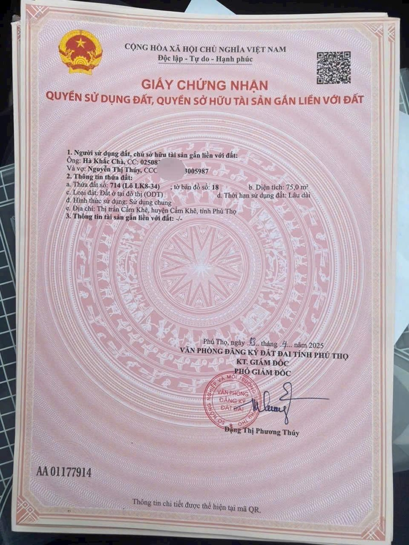 Đừng bỏ lỡ Cẩm Khê Central Park. Đã trao giấy chứng nhận QSDĐ tại dự án Cẩm Khê Central Park. - Địa điểm: Tại VPBH dự án, Thị trấn Cẩm Khê, Huyện Cẩm Khê, Phú Thọ. Với tài chính chỉ từ 770 triệu. Sở hữu ngay lô đất tiềm năng hiếm có khi hội tụ: - Trong thời gian ngắn đã lãi 500 triệu / lô. - Vị trí trung tâm huyện, dân cư đông đúc sẵn có, kinh doanh được luôn. - Xung quanh có tới 500ha đất khu công nghiệp đang hoạt động sản xuất và trong năm 2025 có tới 4 nhà máy lớn đang xây nhà xưởng, chuẩn bị đón chục nghìn công nhân đến làm việc. - Hạ tầng hoàn thiện đồng bộ, hiện đại, tiện ích đẳng cấp. - Sổ đỏ sang tên ngay, nhận đất xây nhà được luôn. - Đất nền không phải xây, đầu tư dễ thanh khoản, tích lũy tài sản an toàn. - Chính sách ưu đãi vô cùng hấp dẫn: Quà tặng lên tới 200 triệu/lô, chiết khấu lên tới 7%, ngân hàng hỗ trợ lãi suất 0% trong 12 tháng, miễn phí trả nợ trước hạn trong 12 tháng. - Đất nền, sổ đỏ, sang tên ngay, không yêu cầu xây dựng. Cẩm Khê Central Parkt - đất nền đô thị giữa thủ phủ công nghiệp - đầu tư chắc thắng. Đừng bỏ lỡ cơ hôị LH: Đặc điểm nổi bậtDiện tích :100m2Mặt tiền :6mGiá :2,5 tỷĐường vào :16m