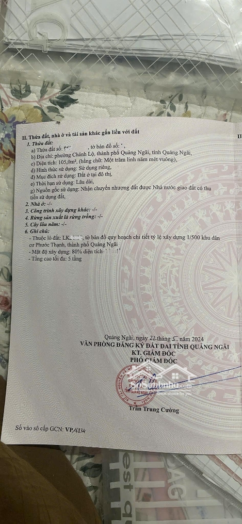 Bán đất nền KDC Phước Thạnh, phường Chánh Lộ nay là phường Cẩm Thành, tỉnh Quảng Ngãi. Khu vực sầm uất, dân cư hiện hữu và hạ tầng hoàn chỉnh. * Thông tin lô đất: - Diện tích: 105m² (ngang 5m x dài 21m). - Hướng: Nam mát mẻ quanh năm. - Đường trước nhà: 13.5m (bao gồm vỉa hè rộng rãi, thông thoáng). - Pháp lý: Sổ đỏ sẵn, sang tên ngay. - Tiện ích xung quanh: Gần trường học, chợ, siêu thị, bệnh viện, thuận tiện xây ở hoặc đầu tư. - Khu vực đông đúc, tiềm năng tăng giá cao, rất thích hợp để xây nhà ở, cho thuê hoặc mở văn phòng kinh doanh. * Liên hệ ngay: Mr Nguyên) tư vấn tận tâm, hỗ trợ xem đất trực tiếp!Đặc điểm nổi bậtDiện tích :105m2Mặt tiền :5mGiá :2 tỷĐường vào :13.5m