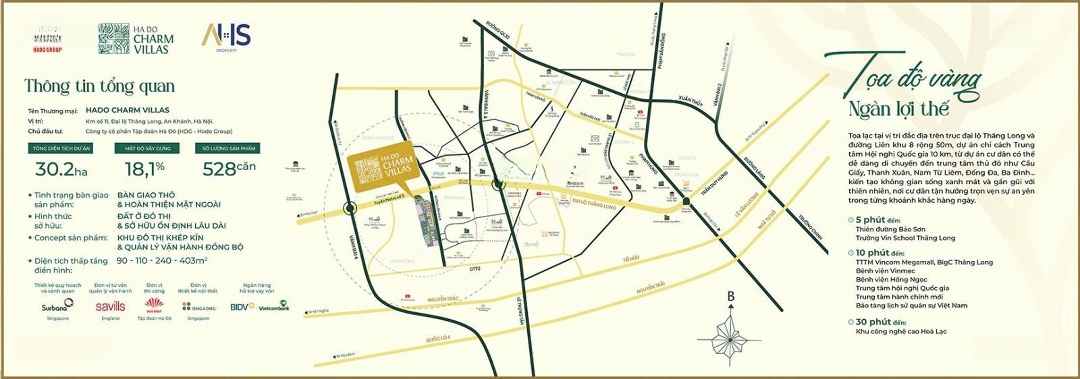 Em chỉ còn đúng 02 căn duy nhất, khả năng đầu tư tốt nhất dự án hiện tại. Hado Charm Villas có tính đầu tư cực lớn ạ: Thông tin dự án Hado Charm Villas. Hotline: - Chủ đầu tư: Công ty Cổ phần Tập đoàn Hà Đô (HDG - Hado Group). - Vị trí: Km số 11, Đại lộ Thăng Long, An Thượng và An Khánh, Hoài Đức, Hà Nội. - Quy mô dự án: 30,2ha với 528 sản phẩm thấp tầng đã hiện hữu và 33 tiện ích nội khu hoàn hảo. - Diện tích điển hình: + Liền kề: 95 - 105 - 110m². + Biệt thự song lập: 190 - 214 - 250m². + Biệt thự đơn lập: 245 - 280 - 300 - 322m². - Mật độ xây dựng: 18,1%. - Concept sản phẩm: Khu đô thị Compound và quản lý vận hành đồng bộ. Đây là Khu đô thị compound duy nhất đang mở bán ở phía Tây Hà Nội. - Đơn vị tư vấn quản lý vận hành: Savills. - Hình thức sở hữu: Lâu dài. Thông tin chi tiết căn liền kề, biệt thự: 1. Căn liền kề. - Mặt đường: 13,5m. Đường rộng của dự án, ô tô để hai bên thoải mái. - Hướng: Đông Nam. Cực mát. - Diện tích: ~100m2. - Xây: 3 tầng và 1 tum cao (sử dụng được). - Diện tích xây: 80m2. - Tổng sàn xây dựng: 226m2. - Nhà đã có sẵn, bàn giao ngay: Ở hoặc cho thuê được ngay. - Bàn giao: Hoàn thiện mặt ngoài. - Giá bán: 21,6 tỷ. 2. Căn biệt thự. - Mặt đường: Nội khu ô bàn cờ, thông thoáng. - Hướng: Đông Nam. Cực mát. - Diện tích: 185m2. - Xây: 3 tầng và 1 tum cao (sử dụng được). - Diện tích xây: 98m2. - Tổng sàn xây dựng: 280m2. - Nhà đã có sẵn, bàn giao ngay: Ở hoặc cho thuê được ngay. - Bàn giao: Hoàn thiện mặt ngoài. - Giá bán: 37,5 tỷ. Chỉ còn đúng 02 căn ạ. Hotline: . ==========================================Đặc điểm nổi bậtDiện tích :100m2Mặt tiền :5mGiá :21,6 tỷSố tầng :3 tầngPhòng ngủ :5 phòngPhòng tắm :5 phòngĐường vào :13.5m