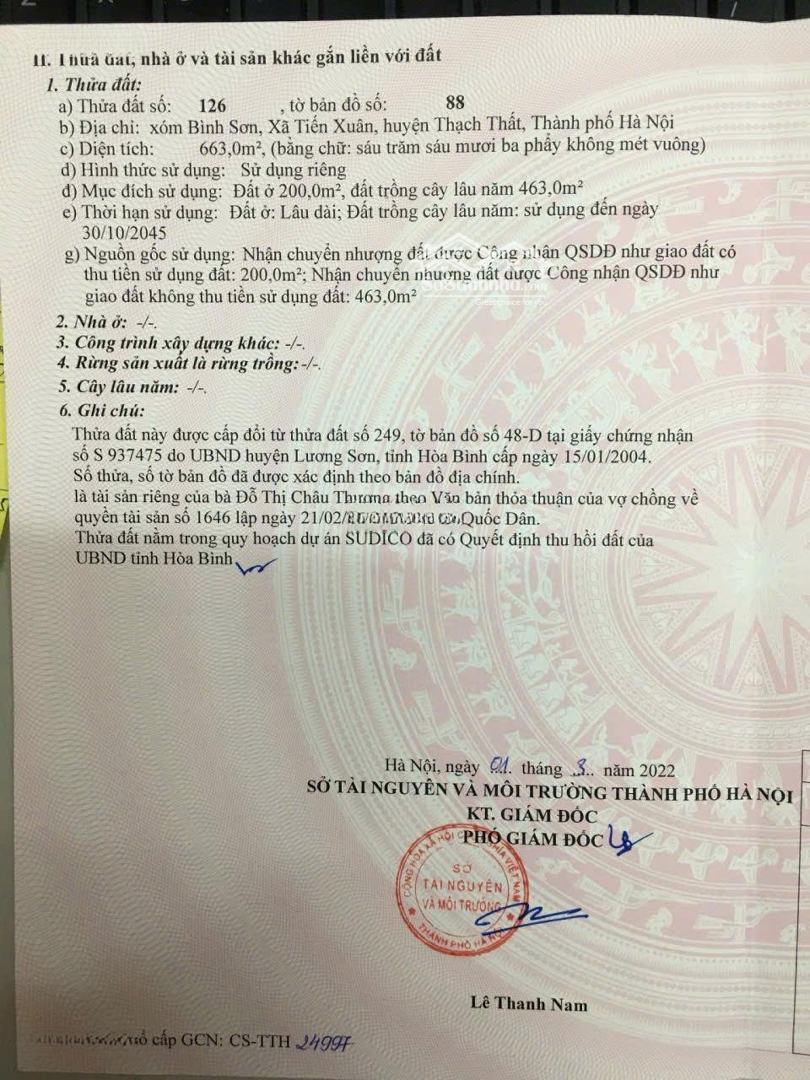 * Địa chỉ: Bình Sơn, Tiến Xuân, Thạch Thất, Hà Nội * Lô góc diện tích 663m2 trong đó có 200m2 đất ở, 2 mặt tiền rộng, thoáng * Cách đường tỉnh 446 chỉ vài trăm mét, lô đất nằm ngay trục đường chính của thôn, đường to rộng, bê tông vào tận nơi * Gần nhà văn hóa thôn, chợ, khu du lịch nghỉ dưỡng,... Liên hệ: Đặc điểm nổi bậtDiện tích :663m2Giá :Giá thỏa thuận