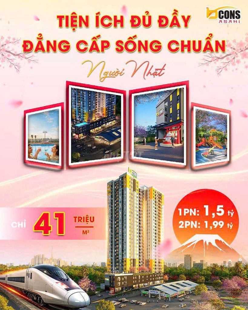 🌸🏙 TIỆN ÍCH ĐẦY ĐỦ – ĐẲNG CẤP SỐNG CHUẨN NGƯỜI NHẬT 🏙🌸 Một không gian sống lý tưởng không chỉ nằm ở thiết kế căn hộ, mà còn ở hệ thống tiện ích nội khu hiện đại, đa dạng nhằm đáp ứng trọn vẹn nhu cầu an cư và thư giãn của cư dân. Tại Bcons Asahi – Green Land Bình An, bạn và gia đình sẽ được tận hưởng: ✨ Khu vườn bách hoa, khu BBQ & thưởng trà ngoài trời ✨ Hồ bơi mùa xuân, khu tập yoga ngoài trời & cung đường dạo bộ trên cao ✨ Khu vực check-in theo mùa, khu vui chơi trẻ em & khu ghế ngồi ngắm mây trời ✨ Khu đọc sách ngoài trời, khu khu vườn an yên… Bên cạnh đó, dự án còn sở hữu 2 mặt tiền lớn (QL1K & Phạm Văn Đồng nối dài), liền kề Metro Mỹ Phước – Tân Vạn, giúp việc di chuyển trở nên nhanh chóng, tiết kiệm thời gian và gia tăng giá trị đầu tư. 💰 Giá hấp dẫn: Chỉ từ 41 triệu đồng/m² Căn hộ 1PN: từ 1,5 tỷ đồng Căn hộ 2PN: từ 1,99 tỷ đồng 🌟 Giữ chỗ ngay hôm nay chỉ với 30 triệu đồng – giữ chỗ có hoàn lại, booking sớm để chọn căn đẹp nhất! ☎️ ***
