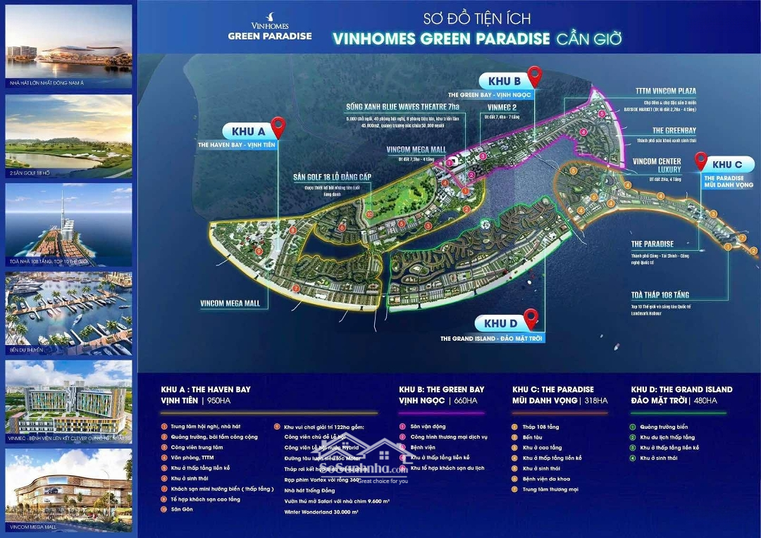 Vinhomes Green Paradise Cần Giờ Siêu Đô Thị Biển Đẳng Cấp Quốc Tế. Chính thức ra mắt: Tháng 10/2025. Liên hệ trực tiếp Giám Đốc Kinh Doanh: để được tư vấn chi tiết. Quy mô & Vị thế. Tổng diện tích 2.870 ha, bao quanh bởi rừng ngập mặn Cần Giờ di sản thiên nhiên UNESCO, vịnh biển xanh và dải cát trắng tuyệt mỹ. Kiến trúc mang đậm hơi thở Âu Châu sang trọng, tinh xảo, mỗi biệt thự là một tác phẩm nghệ thuật kết hợp giữa tinh hoa cổ điển và tiện ích hiện đại. Biệt thự biển Cần Giờ không chỉ là nơi an cư, mà còn là biểu tượng khẳng định vị thế & quyền lực của chủ nhân. 5 Phân khu chiến lược. Khu A 950 ha: Khu ở sinh thái gắn với dịch vụ du lịch, cửa ngõ của toàn dự án. Khu B 660 ha: Tổ hợp ở nghỉ dưỡng dịch vụ công cộng. Khu C 318 ha: Trung tâm tài chính thương mại bến cảng mang tính biểu tượng. Khu D 480 ha: Du lịch nghỉ dưỡng chuẩn quốc tế. Khu E 458 ha: Đô thị sông nước, thiên nhiên len lỏi khắp không gian sống. Cơ cấu sản phẩm. Liền kề: 52m² 63m² 65m² 70m² 90m². Shophouse: 90m² 150m². Biệt thự song lập: 120m² 200m². Biệt thự đơn lập vườn: 220m² 1.000m². Biệt thự mặt biển: 260m² 1.000m². Tiện ích đẳng cấp quốc tế. Sân golf 36 hố chuẩn quốc tế. Clubhouse sang trọng, bể bơi 4 mùa full kính đẹp nhất Việt Nam. TTTM Vincom 6*, bến du thuyền riêng. Hệ thống trường Vinschool, bệnh viện quốc tế Vinmec 6*. Công viên ven biển, quảng trường nghệ thuật, chuỗi resort 5 sao, khu vui chơi giải trí chuẩn châu Á. Dịch vụ quản gia & concierge 24/7 đẳng cấp Ritz - Carlton. Hệ thống sông nước mặn tự nhiên len lỏi quanh biệt thự, mang lại trải nghiệm độc bản. Liên hệ trực tiếp Giám Đốc Kinh Doanh Phạm Nhật: để được tư vấn chi tiết.Đặc điểm nổi bậtDiện tích :52m2Giá :Giá thỏa thuậnSố tầng :5 tầngPhòng ngủ :6 phòngPhòng tắm :6 phòng
