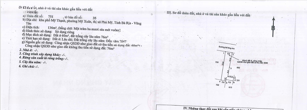 Tài sản đấu giá: Quyền sử dụng đất và tài sản gắn liền với đất tại TĐ: 751, TBĐ: 35, đ/c: P.Mỹ Xuân, TX Phú Mỹ, BR-VT (nay là P.Phú Mỹ, TPHCM) Người có tài sản đấu giá: Ngân hàng TMCP Hàng Hải Việt Nam, địa chỉ: Số 54A Nguyễn Chí Thanh, P.Láng, Hà Nội; Giá khởi điểm: 2,3 tỷ đồng (chưa bao gồm thuế GTGT) . TĐT: 230 triệu đồng. Toàn bộ các loại thuế GTGT và các loại thuế, phí, lệ phí, chi phí khác phát sinh khi thực hiện sang tên chuyển nhượng theo quy định của PL do KH trúng đấu giá chịu trách nhiệm kê khai và thực hiện. KH trúng ĐG có trách nhiệm thanh toán 1 lần tiền mua ts đấu giá (sau khi trừ số tiền đặt cọc) và thuế GTGT trước khi thực hiện ký HĐMB. Xem tài sản: Từ ngày 8/9/2025 đến ngày 10/9/2025, tại TĐ: 751, TBĐ: 35, đ/c: P.Mỹ Xuân, TX Phú Mỹ, BR-VT (nay là P.Phú Mỹ, TPHCM). Các tổ chức, cá nhân có đủ điều kiện tham gia đấu giá theo quy định liên hệ Công ty Đấu giá hợp danh Bất động sản Việt_đ/c: Số 76 (lầu 6) CMT8, P. Xuân Hoà, TP.HCM để mua hồ sơ và nộp hồ sơ tham gia đấu giá hợp lệ kể từ ngày niêm yết việc đấu giá tài sản cho đến 16h00 ngày 22/09/2025. Nộp tiền đặt trước: Từ ngày niêm yết việc thông báo đấu giá tài sản đến 16 giờ 00 phút ngày 22/09/2025 Địa điểm tổ chức đấu giá: Vào lúc 13 giờ 00 phút ngày 25/09/2025 tại Số 76 (lầu 6) CMT8, P. Xuân Hoà, TP.HCMĐặc điểm nổi bậtDiện tích :136m2Giá :2,3 tỷ