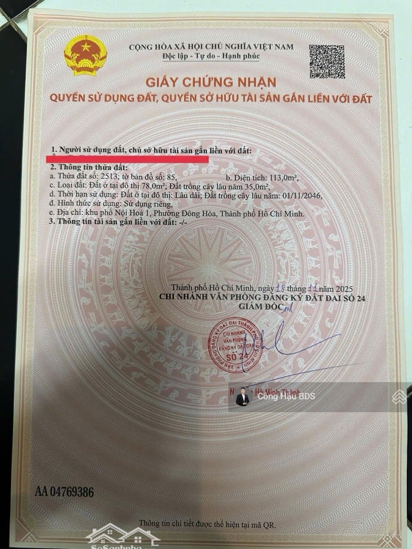 HÀNG HIẾM ĐÔNG HÒA GIÁP QL1K SÁT LÀNG ĐẠI HỌC Đất mặt đường nhựa 5m Xây dựng tự do Thanh khoản cao Vị trí: KP Nội Hóa P. Đông Hòa Dĩ An Giáp QL1K sát Làng Đại Học QG TP.HCM Khu dân cư đông đúc, sinh viên người đi làm kinh doanh nhộn nhịp Diện tích đẹp hiếm khu vực: Lô 1: 113m Thổ cư 78m Lô 2: 137m Thổ cư 84m Pháp lý: Sổ hồng riêng từng nền Xây dựng tự do mua ở, đầu tư, xây trọ, CHDV đều hợp lý Đường nhựa 5m xe hơi ra vào thoải mái Giá chỉ 4.65 tỷ / nền so với khu vực là quá tốt Liên hệ ngay: Công Hậu GCĐặc điểm nổi bậtDiện tích :113m2Mặt tiền :4.35mGiá :4,65 tỷĐường vào :5m