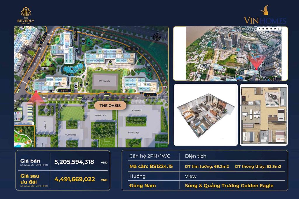 69.2m² (tim tường) Hướng: Đông Nam mát mẻ qua