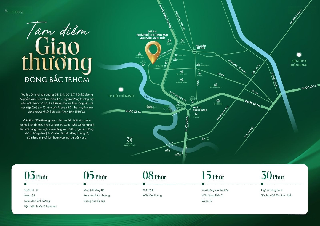 - Tên chủ đầu tư công trình: Công ty TNHH MTV Đầu tư và Quản lý Dự án Bình Dương. Dự án KDC Nguyễn Văn Tiết (CĐT IMP co & TDC). GIÁ CHỈ TỪ 5,75 TỶ.CĂN - THANH TOÁN TRƯỚC 30% ***Bán nhà phố thương mại KDC 3/2 - Nguyễn Trãi - Nguyễn Văn Tiết, P. Lái Thiêu, TpHCM ( Tp Thuận An, Bình Dương cũ ) ****KDC Nguyễn Văn Tiết, P. Lái Thiêu, TP. Thuận An (liền kề TP.HCM)**** 04 mặt tiền đường nội khu D2 D4 D5 D7 ( Lộ giới = 13m ) _ Liên kết trực tiếp Nguyễn Văn Tiết Lái Thiêu 45 _Kết nối nhanh Quốc lộ 13 Metro số 2 Quốc lộ 1A DT743 Mỹ Phước Tân Vạn _Lòng đường 6m xe hơi đậu quanh nhà, vỉa hè 6m, dân trí cao, hàng xóm cán bộ, chủ doanh nghiệp _Tiện ích: Aeon Mall Bình Dương, Lotte Mart, Bv Quốc tế Becamex, Bv Hạnh Phúc, Bv đa khoa Thuận An, trường học, siêu thị đầy đủ ---------------- ----------------- Tiện ích ngoại khu: Aeon Bình Dương, Vsip 1, sân golf Sông Bé, Bệnh viện quốc tế Becamex, bệnh viện Hạnh Phúc, siêu thị Lotte Mart, chợ Lái Thiêu, Bệnh viện quốc tế Colombia, THCS Lái Thiêu, THPT Nguyễn Trãi, TT Hội nghị Thuận An, chợ Thuận An, chợ Bình Chuẩn, Công viên Văn Miếu, công viên Bình Dương... *Diện tích: 5 x 20. 5 x 21. 5 x 22. 5 x 23. 7 x 23. *DTXD : 80% *Thiết kế: 1 Trệt 2 lầu + tum. - BÀn giao FULL 110% mặt ngoài - Tầng trệt: Phòng khách, WC1, WC2, bếp ăn, sân sau. - Lầu 1: Phòng ngủ 2, WC3, WC4, phòng ngủ 1. - Lầu 2: Phòng SH chung, WC5, phòng ngủ 3. - Tầng Thượng: Sân thượng trước, Phòng Giặt Khô, Sân thượng sau. -*Chiều cao xây dựng: Số tầng: 3 tầng + 1 tầng tum. Cao độ nền (tính từ cao độ sân): + 0,30 m. Chiều cao tầng 1: + 4,20 m. Chiều cao tầng 2: + 3,60 m. Chiều cao tầng 3: + 3,60 m. Chiều cao tầng tum: + 2,30 m.Đặc điểm nổi bậtDiện tích :105m2Mặt tiền :22mGiá :5,77 tỷSố tầng :4 tầngPhòng ngủ :4 phòngPhòng tắm :5 phòngĐường vào :15m
