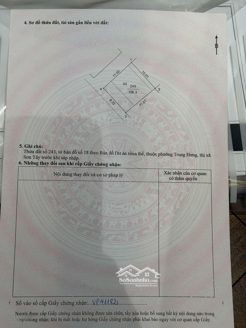 - Diện tích: 106.3m2. - Số tầng: 4 tầng. - Hướng cửa chính: Tây Nam. - Mặt tiền: 9.32m. - Mặt hậu: 10.01m. - Giá: 9 tỷ VND. - Pháp lý: Đã có sổ đỏ. Địa điểm tiện ích xung quanh: - Siêu thị Lan Chi Sơn Tây. - Bệnh viện Đa khoa Sơn Tây. - Các trường học trong bán kính 1km. - Chợ Nông Sản, Chợ Nghệ, Thành cổ Sơn Tây. Liên hệ: Đặng Hải để xem nhà và xem sổ.Đặc điểm nổi bậtDiện tích :106.3m2Mặt tiền :9.32mGiá :9 tỷSố tầng :4 tầng