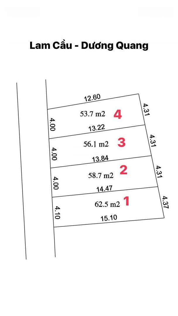 Đất thổ cư 56.1m2 nằm tại Dương Quang, Gia Lâm, Hà Nội. Khu vực yên tĩnh, giao thông thuận lợi. - Diện tích: 56.1m2. - Giá: 54 triệu / m2. - Pháp lý: Sổ đỏ đầy đủ. - Hướng cửa chính: Tây Bắc. - Chiều ngang mặt tiền: 4m. - Chiều rộng ngõ trước: 2.5m. - Đường vào rộng rãi, thuận tiện cho việc di chuyển. - Mặt tiền phù hợp cho các hoạt động kinh doanh nhỏ. - Phong thủy tốt, thích hợp cho việc xây dựng nhà ở. Liên hệ để biết thêm chi tiết: Văn Hưng Đặc điểm nổi bậtDiện tích :56.1m2Mặt tiền :4mGiá :3,03 tỷĐường vào :2.5m