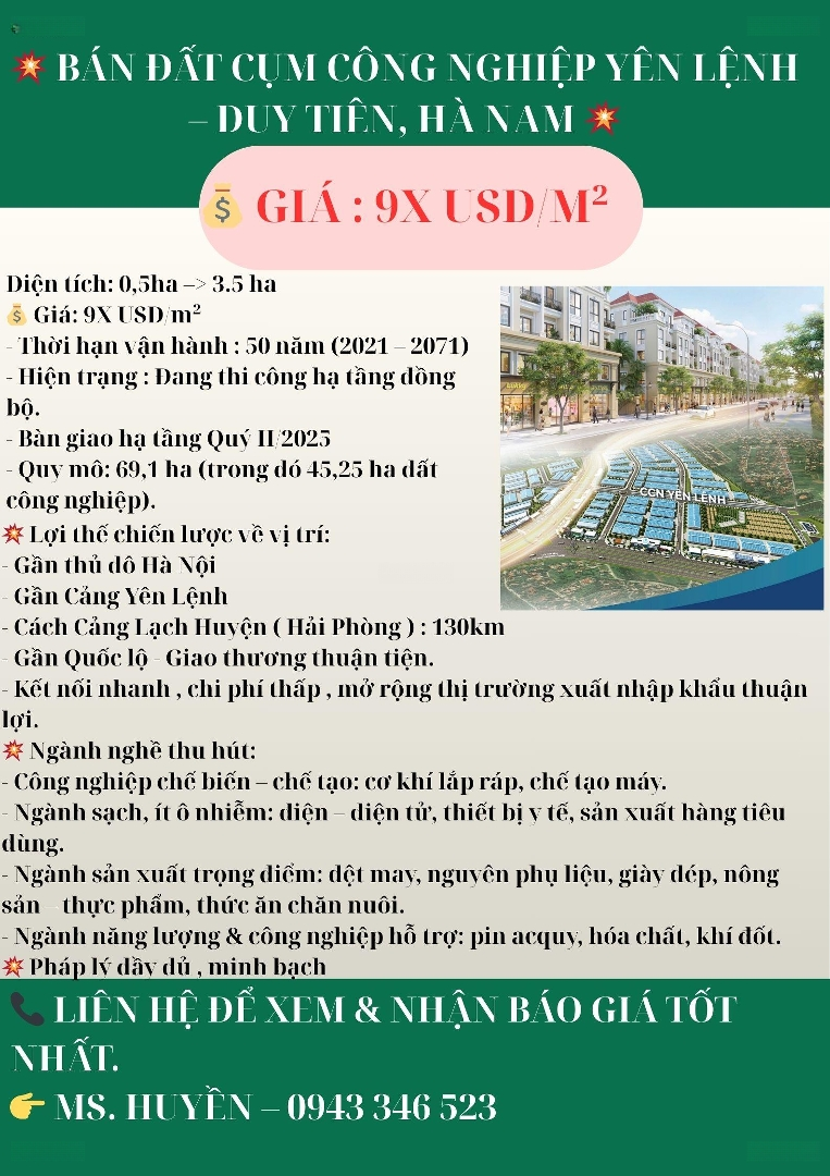 " BÁN ĐẤT CỤM CÔNG NGHIỆP YÊN LỆNH DUY TIÊN, HÀ NAM Diện tích: 0,5ha 3.5 ha Giá: 9X USD/m² - Thời hạn vận hành : 50 năm (2021 2071) - Hiện trạng : Đang thi công hạ tầng đồng bộ. - Bàn giao hạ tầng Quý II/2025 - Quy mô: 69,1 ha (trong đó 45,25 ha đất công nghiệp). Lợi thế chiến lược về vị trí: - Gần thủ đô Hà Nội - Gần Cảng Yên Lệnh - Cách Cảng Lạch Huyện ( Hải Phòng ) : 130km - Gần Quốc lộ - Giao thương thuận tiện. - Kết nối nhanh , chi phí thấp , mở rộng thị trường xuất nhập khẩu thuận lợi. Ngành nghề thu hút: - Công nghiệp chế biến chế tạo: cơ khí lắp ráp, chế tạo máy. - Ngành sạch, ít ô nhiễm: điện điện tử, thiết bị y tế, sản xuất hàng tiêu dùng. - Ngành sản xuất trọng điểm: dệt may, nguyên phụ liệu, giày dép, nông sản thực phẩm, thức ăn chăn nuôi. - Ngành năng lượng & công nghiệp hỗ trợ: pin acquy, hóa chất, khí đốt. Pháp lý đầy đủ , minh bạch Liên hệ để xem & nhận thông tin chi tiết ! "Đặc điểm nổi bậtDiện tích :35000m2Mặt tiền :50mGiá :94,5 tỷĐường vào :24m