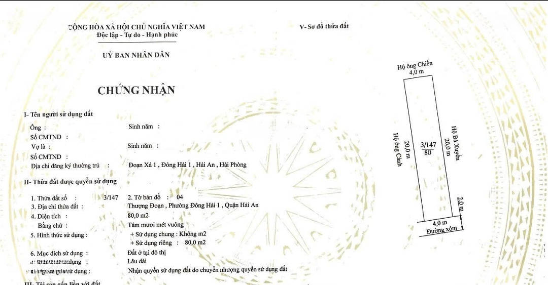 Bán đất ngõ ô tô Phủ Thượng Đoạn giá tốt nhất khu vực. - Diện tích: 80m2 ngang rộng, đất vuông vắn. - Hướng: Nam mát mẻ, hợp phong thủy. - Đường trước nhà rộng 4m, ô tô đỗ cửa thoải mái, ngõ thông sang Vườn mơ và Bùi thị từ nhiên. - Khu dân cư đông đúc, an ninh tốt, gần chợ, trường học, giao thông thuận tiện. - Giá chỉ: 39 triệu/m có thương lượng. Liên hệ: Em Hàm Hương Chuyên nhà đất khu vực Hải An Lê Hồng Phong BĐS chính chủ, giá tốt.Đặc điểm nổi bậtDiện tích :80m2Mặt tiền :4mGiá :3,12 tỷĐường vào :4m