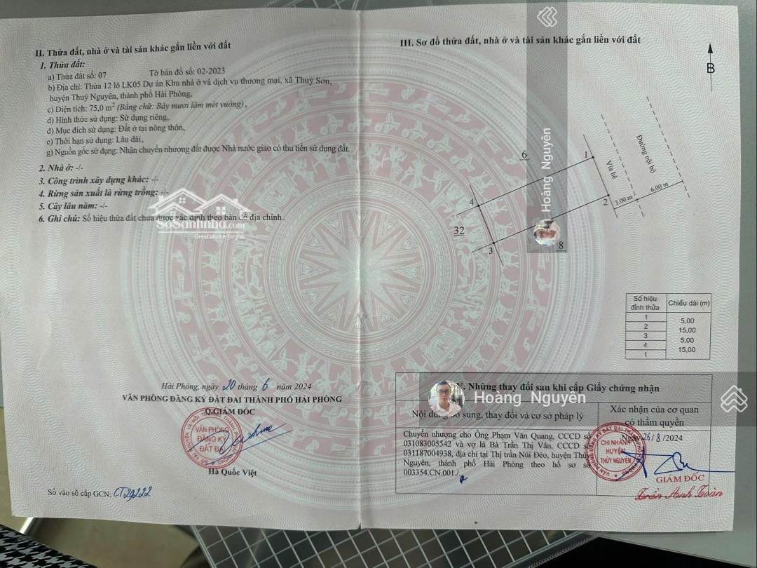 Quang Minh Green City, Phường Thiên Hương, Thủy Nguyên, Hải Phòng, là khu đất nền lý tưởng cho những ai tìm kiếm một không gian sống tiện nghi và gần gũi với thiên nhiên. Với diện tích 75m2 và giá 2,8 tỷ VND, đây là cơ hội đầu tư không thể bỏ qua. + Đất thổ cư, pháp lý đầy đủ. + Mặt tiền 5m, ngõ vào rộng 13m, thuận tiện cho việc đi lại. + Thiết kế gần gũi với thiên nhiên, có các tuyến đi bộ ven sông. + Khu đô thị đa chức năng với nhiều tiện ích. + Nội thất đầy đủ: Điều hòa, tủ lạnh... Điểm đặc biệt: - Nằm trong khu đô thị hiện đại, có không gian sống xanh, thoáng đãng. - Mặt tiền rộng, thích hợp cho kinh doanh hoặc xây dựng. - Pháp lý đầy đủ, thuận lợi cho việc xây dựng và phát triển. Gần các tiện ích như: - Gần Ngọc Am Mart - siêu thị điện máy. - Khu vực có nhiều trường học, chợ, siêu thị, công viên. Thông tin dự án: - Dự án: Quang Minh Green City, do Quang Minh đầu tư. - Vị trí: Xã Thủy Sơn, Thiên Hương và Hoa Động, Huyện Thủy Nguyên, Hải Phòng. - Thiết kế: Khu đô thị đa chức năng với 15 khu vực, chủ yếu là công trình thấp tầng, sử dụng vật liệu truyền thống, gần gũi với thiên nhiên. - Tiện ích: Khu phức hợp mua sắm, ẩm thực, bưu điện, ngân hàng, khách sạn 4 sao, khu vui chơi giải trí, hồ bơi, khu biệt thự, nhà hàng ven sông, khu thể dục thể thao, bến du thuyền, khu nghỉ dưỡng, trung tâm văn hóa thể thao. Vui lòng liên hệ và Hoàng Nguyên để biết thêm thông tin.Đặc điểm nổi bậtDiện tích :75m2Mặt tiền :5mGiá :2,8 tỷĐường vào :13m
