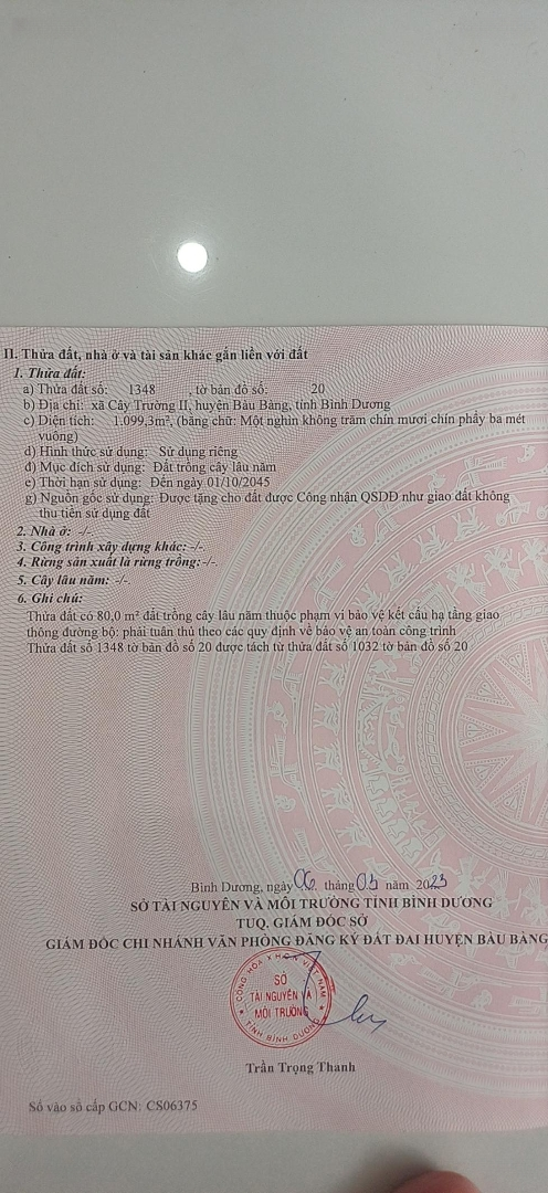 Đất nền tại Đường DH614, Xã Cây Trường II, Bàu Bàng, Bình Dương có diện tích 1099 m2, phù hợp cho nhu cầu xây dựng nhà ở hoặc đầu tư. - Diện tích rộng rãi 1099 m2, thuận lợi cho nhiều mục đích sử dụng + - Giá 4,2 tỷ VND, hợp lý cho vị trí và tiềm năng phát triển + - Mặt tiền 10m, phù hợp cho kinh doanh hoặc xây dựng nhà phố + - Pháp lý đầy đủ, giúp đảm bảo quyền lợi cho người sở hữu + Ưu điểm: Mặt tiền 10m rộng rãi, tạo thuận lợi cho việc kinh doanh hoặc xây dựng nhà ở. Pháp lý đầy đủ, mang lại sự an tâm cho khách hàng. Liên hệ ngay để biết thêm thông tin chi tiết qua số điện thoại hoặc liên hệ với Hạnh.Đặc điểm nổi bậtDiện tích :1099m2Mặt tiền :10mGiá :4,2 tỷ