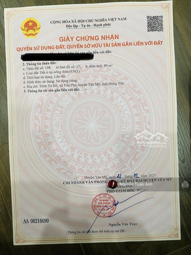 Nhanh tay sở hữu lô đất đẹp tại Xã Yên Phú, Huyện Yên Mỹ, Hưng Yên. Diện tích 89m2 với mặt tiền 4.5m, giá chỉ 2,3 tỷ VND. Đường vào rộng 3.5m, thuận tiện cho xe ô tô, phù hợp cho việc xây dựng nhà ở hoặc đầu tư. Pháp lý đầy đủ, đảm bảo an toàn cho giao dịch. + Mặt tiền 4.5m, thuận lợi cho kinh doanh. + Đường vào rộng 3.5m, dễ dàng di chuyển. + Pháp lý đầy đủ, đảm bảo an tâm cho khách hàng. Liên hệ ngay để biết thêm chi tiết: , Nguyễn Tuấn Anh.Đặc điểm nổi bậtDiện tích :89m2Mặt tiền :4.5mGiá :2,3 tỷĐường vào :3.5m