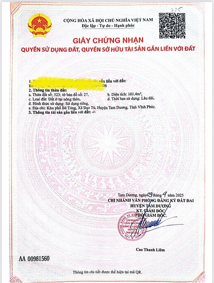 Nhanh tay sở hữu lô đất tại Quốc lộ 2C, Xã Đạo Tú, Tam Dương, Vĩnh Phúc. Diện tích 100m2, giá 4,02 tỷ. Điểm nổi bật: Lô đất có vị trí thuận lợi, phong thủy tốt, thích hợp cho việc xây dựng nhà ở hoặc đầu tư. Đất đã được san lấp, có đường đi vào thuận tiện. Đặc biệt, khu vực này có không gian sống yên tĩnh, trong lành, phù hợp cho những ai tìm kiếm sự bình yên. Gần khu vực có mầm non xanh, tạo điều kiện thuận lợi cho gia đình có trẻ nhỏ. Liên hệ ngay để được tư vấn miễn phí và biết thêm thông tin chi tiết. Lê Đình Cao Đặc điểm nổi bậtDiện tích :100m2Giá :4,02 tỷ