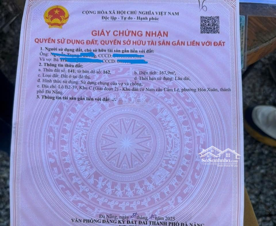 Cần bán lô đất vị trí đẹp tại khu dân cư Nam cầu Cẩm Lệ phường Hòa Xuân, quận Cẩm Lệ, Đà Nẵng, khu vực dân cư hiện hữu, hạ tầng hoàn chỉnh, an ninh tốt, thích hợp an cư hoặc đầu tư lâu dài. Diện tích: 167,9 m² Thời hạn sử dụng: Lâu dài Pháp lý: Sổ hồng riêng, đầy đủ, sang tên nhanh Vị trí & tiềm năng: Nằm trong khu dân cư quy hoạch đồng bộ Nam cầu Cẩm Lệ Kết nối nhanh các trục đường lớn, thuận tiện di chuyển vào trung tâm Khu vực có nhu cầu ở thực cao, tiềm năng tăng giá tốt theo hạ tầng Giá bán: 9,8 tỷ. Có thương lượng cho khách thiện chí Liên hệ Lâm: Đặc điểm nổi bậtDiện tích :167.9m2Giá :9,8 tỷ