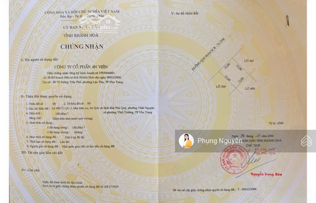 Cần bán Lô góc 2 mặt tiền đường lớn 26m và 21m, đầu khu 1, tiếp giáp dự án Vinhomes Pearl Bay Nha Trang của Vingroup. Vị trí chiến lược cực đẹp. - Diện tích: 182,5m2 (12x15). - Hướng Tây Bắc. - Sổ đỏ lâu dài. - Lô bên cạnh 180m2 bán luôn nếu anh chị có nhu cầu mua 2 lô cặp. - Giá 145tr/m2. * Anh chị quan tâm liên hệ: - em Phụng Nguyễn Tuệ Minh. Xin chân thành cảm ơn!Đặc điểm nổi bậtDiện tích :182.5m2Mặt tiền :12mGiá :26,46 tỷĐường vào :21m