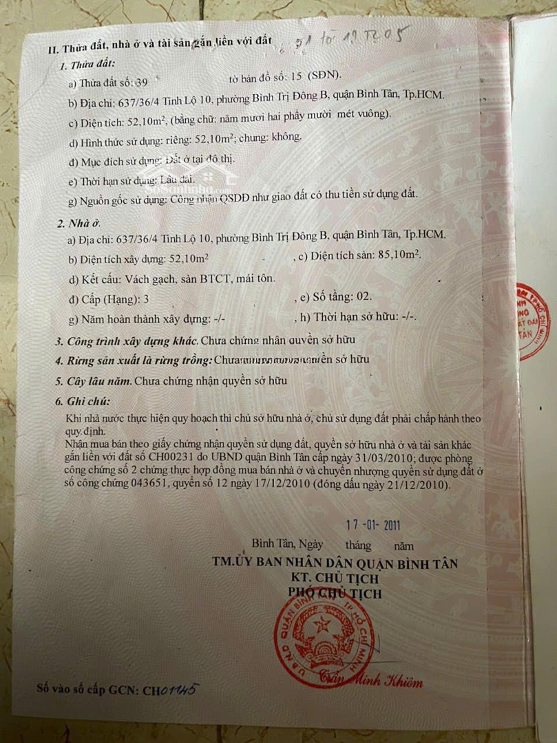 Bán nhà chính chủ tọa lạc tại địa chỉ 637/36/4 Tỉnh Lộ 10, P Bình Trị Đông B, Q. Bình Tân, HCM - Tài sản rao bán tọa lạc tại hẻm 637 Tỉnh Lộ 10, hẻm rộng, xe hơi vào được, thông giữa đường Tỉnh lộ 10 và đường số 29 (khu tên lửa) - Thuộc kdc ổn định, yên tĩnh, (kế bên nhà là giáo viên mầm non), đầu hẻm 637 Tỉnh Lộ 10 là trường Tiểu học Bình Trị 2, Ngân hàng ACB, Sacombank, Agribank, Bách hóa xanh, circle K (chưa tới 1 phút chạy xe máy) - Tài sản cách đường Vành Đai Trong khoảng 2 phút chạy xe máy (đường Vành Đai Trong tọa lạc nhiều ngân hàng như Vietcombank, BIDV, ACB, VP Bank, Nam á Bank... và nhiều nhà hàng, quán ăn) - Cách UBND, công an Phường Bình Trị Đông B (chưa tới 5 phút chạy xe máy) - Cách chợ Bình Trị, chợ khu phố 3, Chợ tạm, Coopmart, Aeon Bình Tân (khoảng 7 phút chạy xe máy là tới) - Trong bán kính 3km là Trường mẩm non Kindy City Internatinal, trường Tiểu học Bình Trị 2, THCS, THPT Phan Chu Trinh, Ngôi sao, trường cao đẳng Nông nghiệp Nam Bộ - Cách bệnh viện Triểu An, Gia An 115, Bình Tân khoảng 10 phút chạy xe máy - Cách nhà thờ PhaoLo khoảng 700m - Cách Chùa Huệ Nghiêm khoảng 1,5km - Khu vực an ninh, yên tĩnh, có nhiều công viên cây xanh - Cách nhà 300m có bãi giữ xe otoĐặc điểm nổi bậtDiện tích :52.1m2Mặt tiền :4mGiá :5,5 tỷSố tầng :1 tầngPhòng ngủ :2 phòngPhòng tắm :3 phòngĐường vào :4m