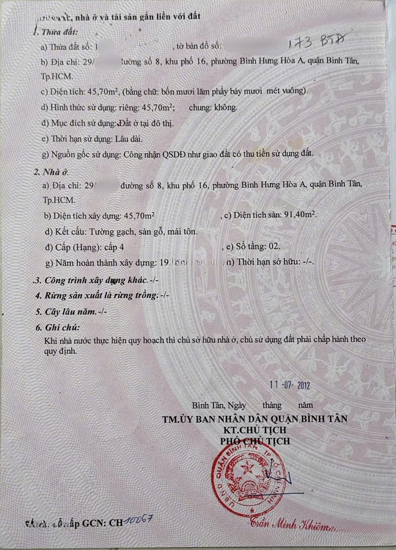 - Gần NGÃ TƯ BỐN XÃ - Giá: 5tỷ350 TL (Chính chủ có giá tốt cho khách xem nhà). SIÊU PHẨM sắp hoàn thiện hẻm 5m 1/ Đường Số 8 (LÊ VĂN QUỚI), P. Bình Hưng Hoà A, Bình Tân. - DT: 3,8m x 12m (Đúc BTCT 1 trệt 1 lầu 3 PN - 2WC - Bếp - phòng khách). - Vị trí: Khu dân cư an ninh yên tĩnh, hẻm xe hơi, gần Ngã Tư Bốn Xã, gần chợ. - Hướng tây. Sổ hông 2025 hoàn công. LH ngay Zalo) xem nhà và làm việc chính chủ.Đặc điểm nổi bậtDiện tích :45.6m2Giá :5,35 tỷ