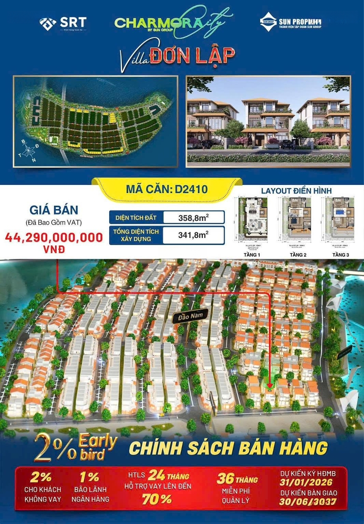 CĂN BIỆT THỰ ĐƠN LẬP MẶT SÔNG D2410 GIÁ CĐT KHÔNG CHÊNH - SUN NHA TRANG - Sổ hồng sở hữu lâu dài - Diện tích: 358.81m, ngang 15m, hướng Đông Nam mát mẻ - Diện tích XD 128.4m, tổng DT sàn: 341.8m2 - Thiết kế đẳng cấp, độc bản chuẩn Sun Group - Cạnh ngay bờ sông, công viên ven sông - Nhà xây 3 tầng, bàn giao hoàn thiện mặt ngoài, thô bên trong - Giá niêm yết CĐT: 44tỷ290tr - Phương thức thanh toán linh hoạt, chiết khấu tối đa đến 18.5% - Ngân hàng hỗ trợ vay 70%, hỗ trợ lãi suất 0% đến 24 tháng - Miễn phí 36 tháng phí quản lý Liên hệ tư vấn: Quang ĐứcĐặc điểm nổi bậtDiện tích :358.81m2Mặt tiền :15mGiá :44,29 tỷPhòng ngủ :5 phòngPhòng tắm :5 phòngĐường vào :16m
