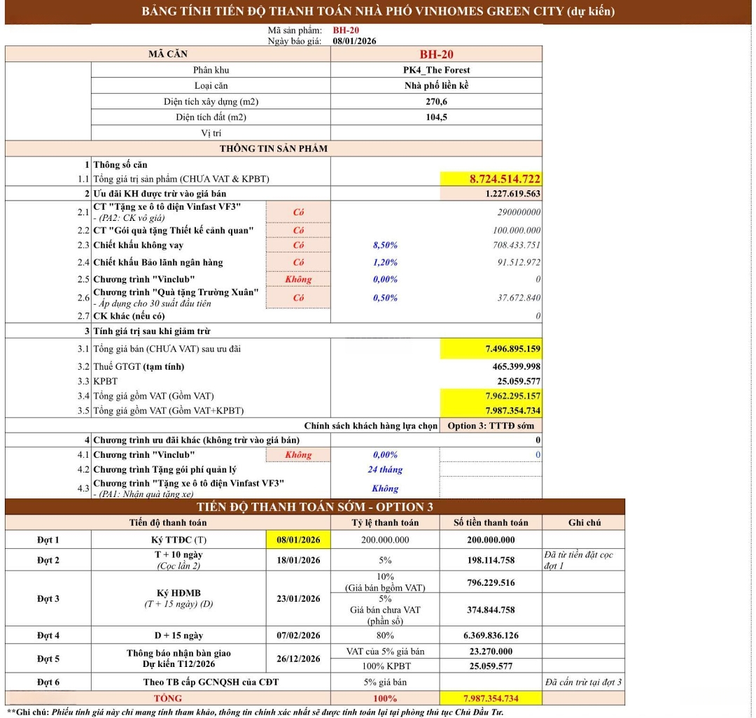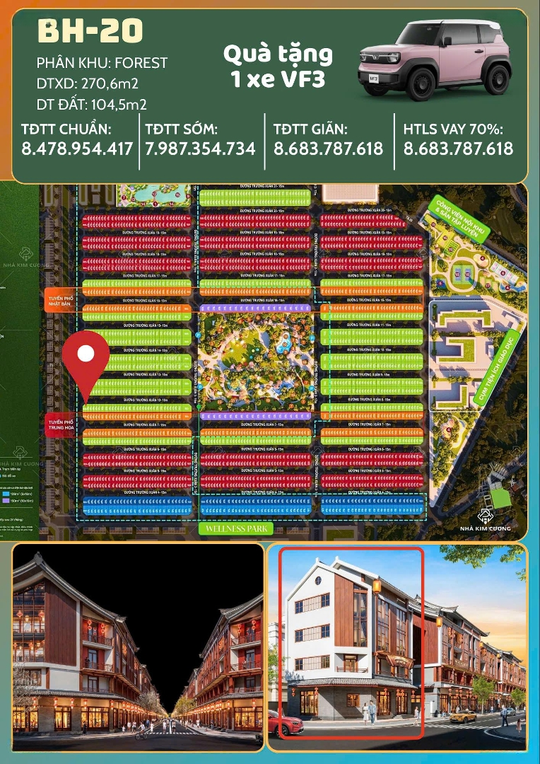 Siêu phẩm cuối cùng của phố kinh doanh Trung Hoa tại dự án Vinhomes Green City. Không còn căn thứ 2 nào tốt hơn thời điểm hiện tại. Vị trí căn góc 2 mặt tiền đường 3/2 và đường Trường xuân. Địa điểm check in và kinh doanh sôi động 24/7 Thông tin chi tiết căn Góc BH-20 - Diện tích đất 104,5 m2, DTXD 270 m2: Thiết kế 1 trệt 2 lầu và 1 tầng đa chức năng - Vị trí cực phẩm của toàn dự án: căn Góc mặt tiền đường 3/2 trục dường xương sống và nằm trên tuyến phố Trung hoa nơi được định hình là vui vui chơi giải trí 24/7 - Giá bán vô cùng hấp dẫn: 7,496 tỷ( chưa gồm VAT) Chính sách bán hàng siêu ưu viết: Tổng mức Chiết khấu lên đến 21%, tặng xe VF3, Vay 70% HTLS trong 24 tháng..... Liên hệ ngay để sở hữu căn nhà phố với vị trí độc nhất này.Đặc điểm nổi bậtDiện tích :104.5m2Mặt tiền :10mGiá :7,5 tỷSố tầng :4 tầngPhòng ngủ :5 phòngPhòng tắm :4 phòngĐường vào :50m