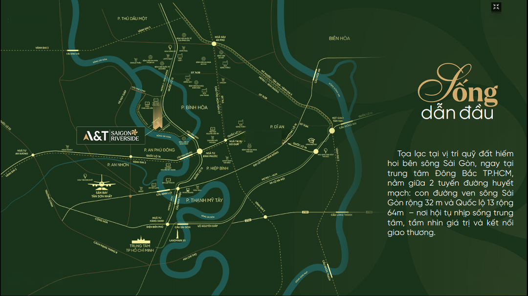 Sản phẩm A&T Saigon Riverside rất được săn đón vì dự án mang sự Kiêu Hãnh, sang trọng và tinh tế, dự án A&T Saigon Riverside sẽ là tuyệt tác được kiến tạo hoàn mỹ, đẳng cấp đến từng chi tiết, có bến du thuyền ngay dưới nhà thể hiện đẳng cấp giàu có Tên dự án: A&T Saigon Riverside. Vị trí: Số 54C, Cách Mạng Tháng 8, khu phố Hòa Long, Phường Lái Thiêu, Thành phố Hồ Chí Minh. Chủ đầu tư: Công ty Cổ phần Đầu tư Phát triển Đô thị A&T Bình Dương. Đơn vị hợp tác đầu tư: Công Ty CP Xây dựng CDC. Đơn vị quản lý vận hành: Anabuki. Quy mô: 7.684 m². Mật độ xây dựng: 45%. Loại hình: Căn hộ, shophouse, Số block: 2 tháp căn hộ. Số tầng cao: 40 tầng nổi & 2 tầng hầm. Số lượng căn hộ: 946 căn hộ + 17 căn shophouse. Diện tích căn hộ từ: 60m². Tiện ích: Trung tâm thương mại, công viên cây xanh, nhà hàng, cafe, sảnh đón sang trọng, khu checkin, sảnh đón khách, hồ bơi tràn, gym spa, xông hơi, Khu vườn trên mây. Pháp lý dự án: Đã có giấy phép xây dựng, 1/500, PCCC, Chấp Thuận Đầu Tư,.. Giá bán: 60 tr/m². Bàn giao: 2028.Đặc điểm nổi bậtDiện tích :65m2Giá :56 triệuPhòng ngủ :2 phòngPhòng tắm :2 phòng