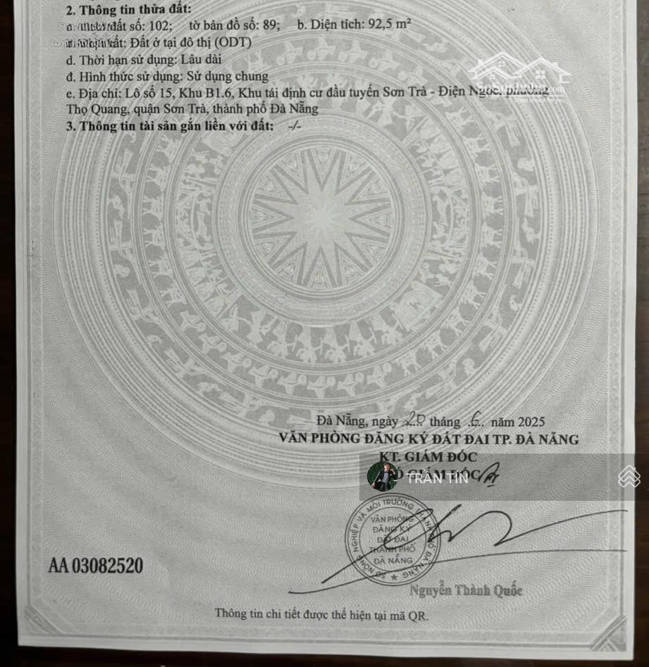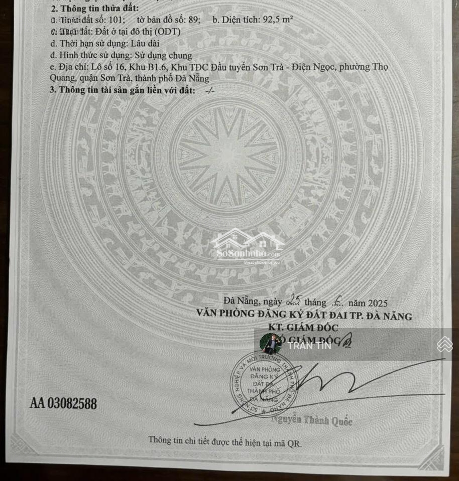 Cặp đất mặt tiền đường Thành Vinh 4, Cách biển 100M Diện tích : 10m x 18.5m = 185m2 Hướng Tây Bắc, đường 5m5 vỉa hè 3m Phù hợp xây nhà ở định cư, Villa, toà Căn Hộ Apartment GIÁ BÁN : 17 tỷ ~ 91 triệu/m2 Liên hệ : Đặc điểm nổi bậtDiện tích :185m2Giá :17 tỷ